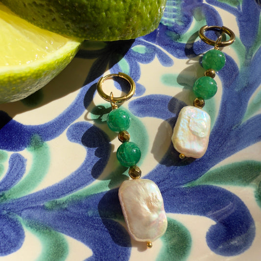 Boucles d'oreilles Perle d'eau douce, Perle de cristal de bohème dorée et Pierre verte
