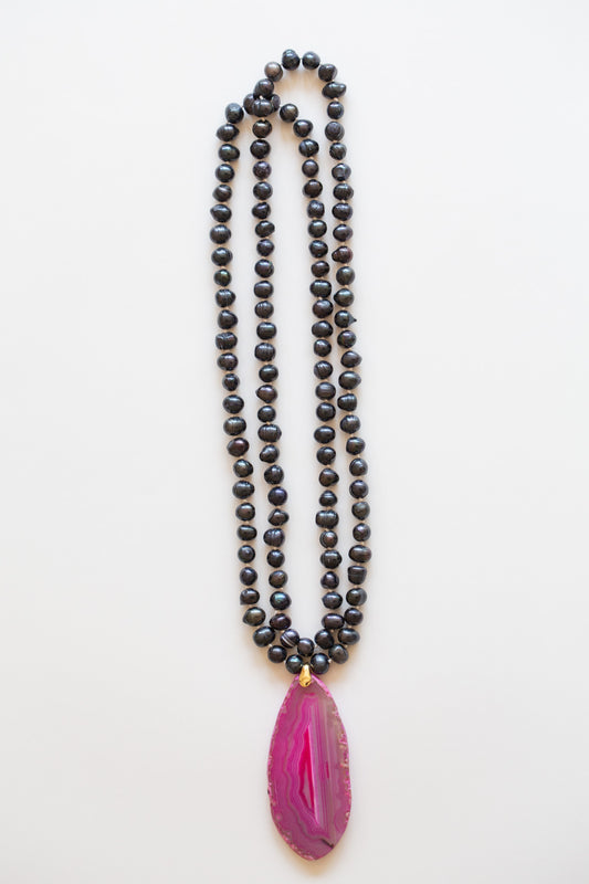 Sautoir double tour de Perle d'eau douce gris irisé et Pierre d'Agate rose