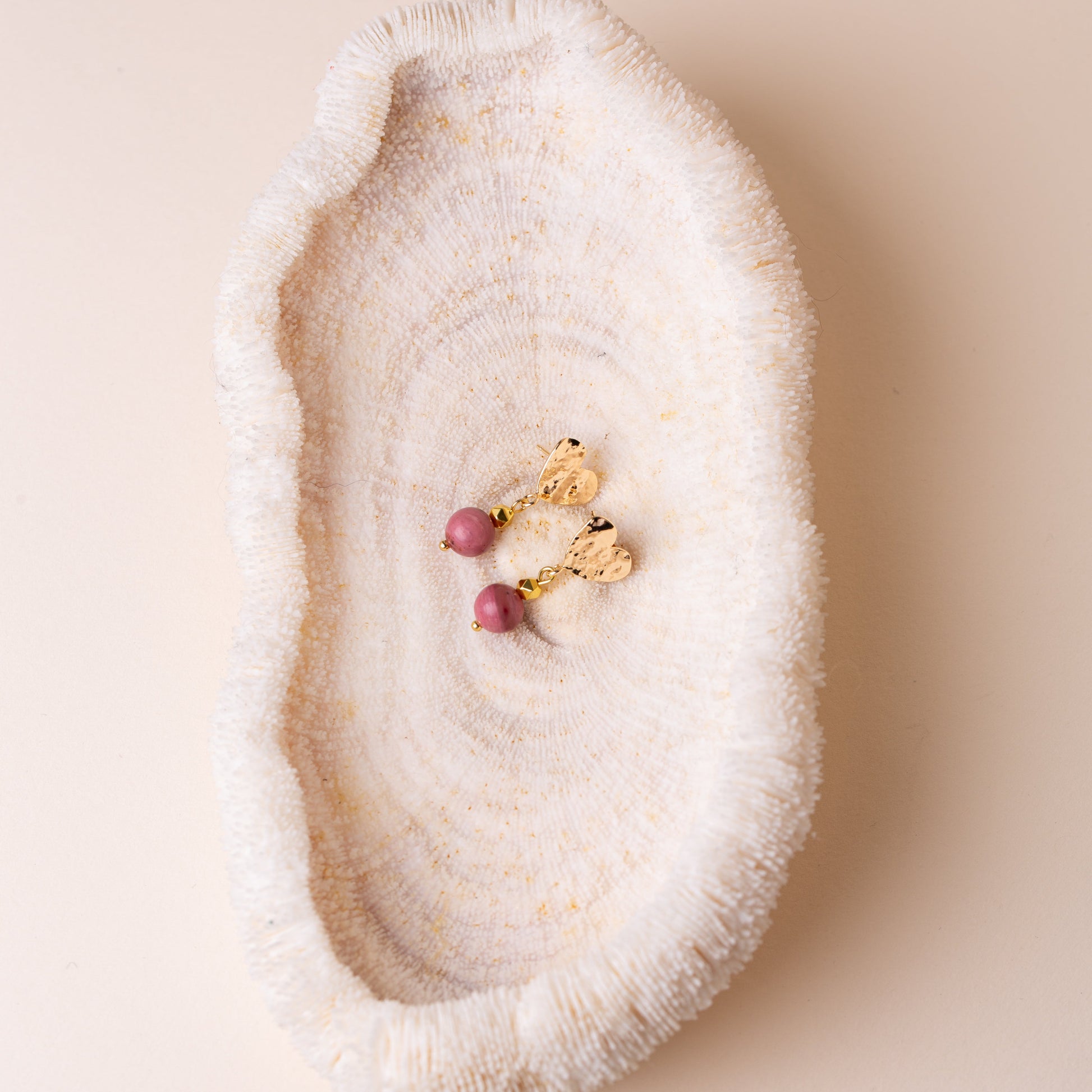 Élégantes et pleines de caractère, ces boucles d’oreilles se distinguent par leur attache martelée en forme de cœur, associée à la beauté authentique d’une rhodonite naturelle. Reconnaissable à ses nuances de rose poudré veiné de noir, la rhodonite apporte une touche chaleureuse et originale à ce bijou au charme artisanal.