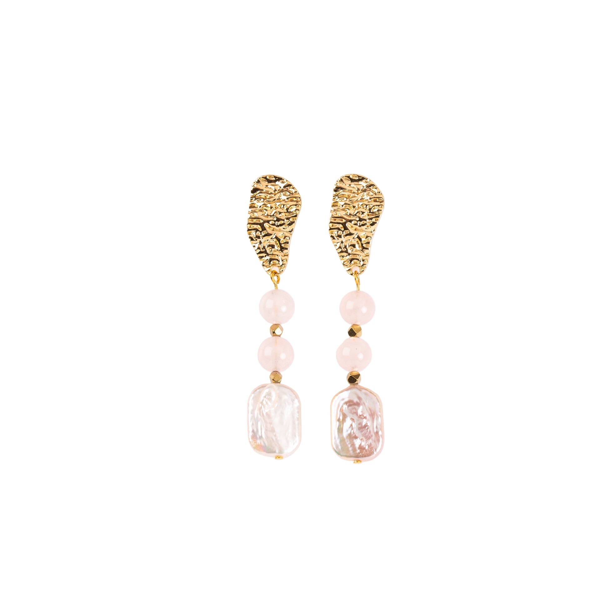 Boucles d’oreilles en plaqué or à attache martelée, délicatement ornées de quartz rose et de perles d’eau douce. Une création lumineuse, mêlant douceur et élégance naturelle.